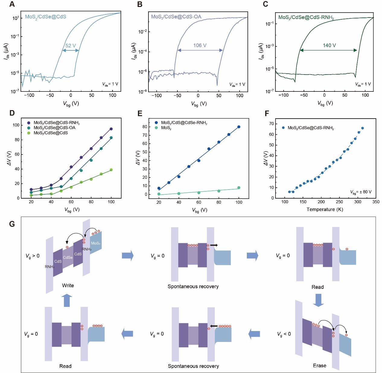 基于上述实验证据,团队创新性地提出“级联电荷转移”机制与“中继站”物理模型。该模型将电子转移过程形象地比喻为一场“接力赛”:电子首先从MoS2沟道可逆地注入至CdS壳层表面——这一步骤由化学势梯度诱导发生;随后,在较高栅压驱动下,电子通过FN隧穿穿越壳层势垒,被稳定限域在CdSe核内,实现长期存储(图3)。