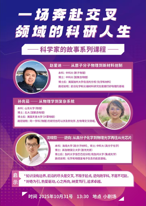 为了贯通“高中-大学”人才培养,创设融通式教育场境,提升学生的创新素养,上海科技大学物质科学与技术学院和上海科技大学附属学校共同策划了“科学家的故事”系列讲座。10月31日,恰逢中国科学院科学节前夕,来自物质学院的三位教授联袂为附属学校的初高中同学带来了别开生面的主题讲座,分享他们的成长经历和人生规划,使同学们打破对“科学研究”的陌生感,鼓励他们树立远大的人生目标。