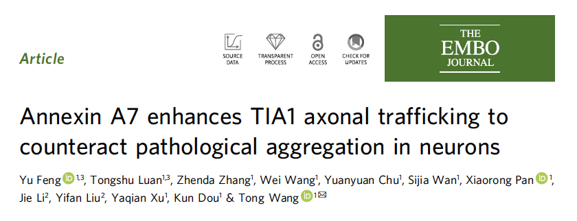 近日,上海科技大学生命科学与技术学院王彤课题组在《欧洲分子生物学学会杂志》(The EMBO Journal)发表题为“Annexin A7 enhances TIA1 axonal trafficking to counteract pathological aggregation in neurons”的研究文章,报道了钙调蛋白 Annexin A7(ANXA7)介导无膜细胞器——核糖核蛋白颗粒(RNP)沿神经元轴突由末梢至胞体逆向运输的分子机制,可防止与渐冻人症相关的 TIA1 蛋白及其货物 mRNA 在轴突内异常聚集,从而避免由此引发的神经元退行性改变。本研究首次阐明了神经元轴突内RNP这一无膜细胞器的逆向运输机制,为神经退行性疾病的靶向治疗研究提供了新的思路。