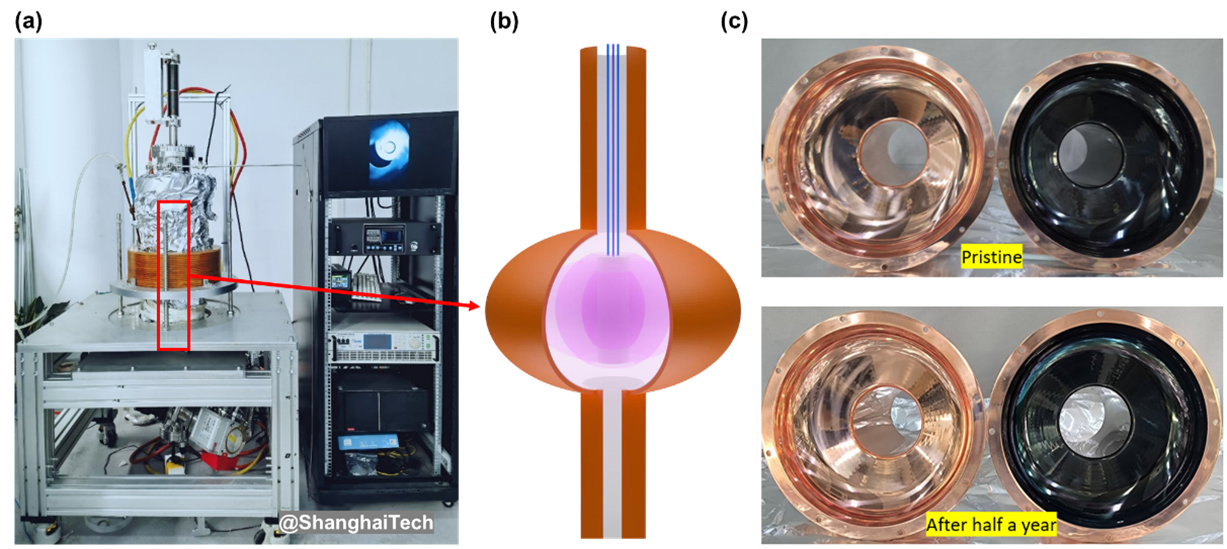 图1. (a) HiPIMRS装置。(b) 铜腔内部高能脉冲磁控溅射工作示意图。 (c)1.3GHz铜腔溅射前后外观对比,下图为放置半年后的照片。