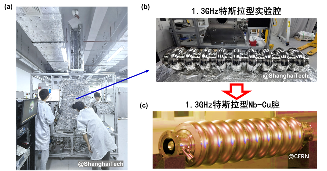 在上海科技大学“双一流”材料学科项目支持下,拓扑物理实验室与大科学中心联合团队经过三年攻关,成功自主研发了高能脉冲磁控溅射-反溅射装置(HiPIMRS,图1),并利用该装置制备出1.3 GHz超导铌-铜加速腔。团队的核心创新在于开发了原位等离子清洗技术,有效解决了铜腔表面预处理过程中的退化和氧化难题。该技术结合优化的原位等离子清洗工艺,实现了原子级平整且无氧化物的Nb/Cu界面,显著增强了铌膜与铜腔基底的结合强度这一关键性能指标。所制备的铌薄膜表面平整(粗糙度Ra < 20 nm),晶体结构呈现(110)择优取向。电学测量证实,整个腔体内铌薄膜的超导临界温度均匀且高达8.7 K,薄膜的超导性能优异。此项技术的成功研发为提升超导加速腔的综合性能提供了突破性解决方案。基于此技术,团队正稳步推进1.3GHz 9-cell超导铌-铜加速腔的研发工作(图2)。