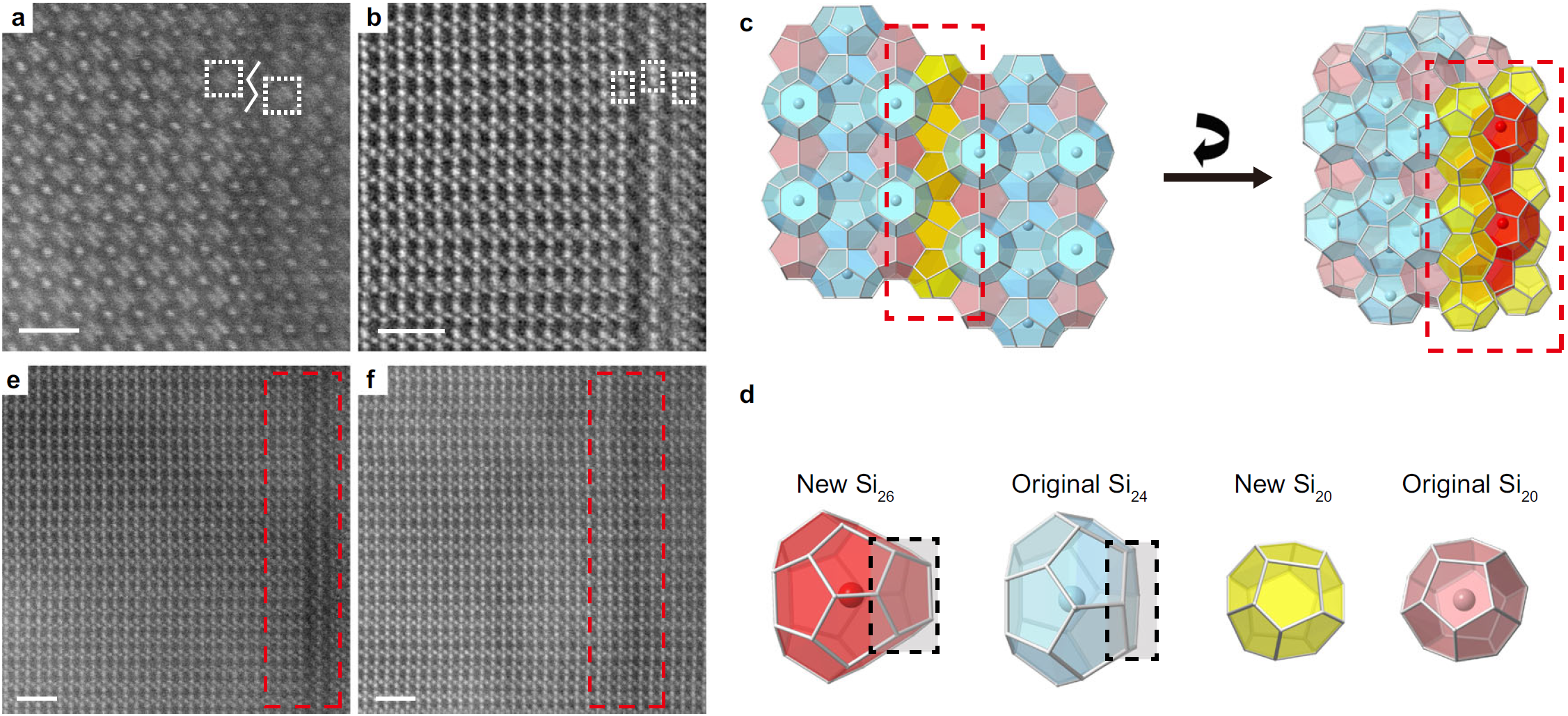 此次,研究团队利用合作者提供的Ba8-xSi46 样品,依托上海科技大学物质学院电镜中心先进电子显微平台,通过原子分辨高温加热原位实验,清晰展示了Ba原子逐步释放过程:首先较小的Si20笼内Ba原子损失,形成Ba0Ba6Si46;随后较大的Si24笼内Ba原子释放,最终在纳米晶体边缘薄区域(厚度约4-6 nm)形成无客体纯硅Si46结构。实验还观察到,晶体缺陷区域存在新的Si26[51263]笼,且适当温度下缺陷会发生自我修复,为未来材料的性能调控提供了新思路。