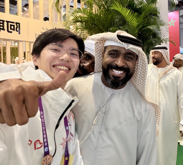 在今年的进博会服务中,令崔誉轩印象深刻的是与阿联酋人文表演团队及大使馆代表的交流互动经历。作为演出区域“小叶子”,他负责全流程引导与协调。表演间隙,崔誉轩主动留在休息区继续服务,为表演团人员取水、协助沟通送餐车辆、对接行程与通行细节,确保团队无缝衔接演出;他主动为大使馆工作人员提供指引服务,陪同他们在场馆内参观,使他们能够快速抵达各展厅内的阿联酋展台。他对工作认真细致的态度和热情得到了对方的认可与赞扬。阿联酋表演团队还热情地邀请他体验当地传统舞蹈“阿亚拉舞”。从轻轻抬臂到跟随节奏舞动,他的尝试引来对方阵阵掌声与鼓励。分别时,大使馆人员向他致谢,并表示“你让我们感到很温暖”。一句简短的话,让崔誉轩深刻感受到青年志愿者在跨文化沟通中起到的重要作用。