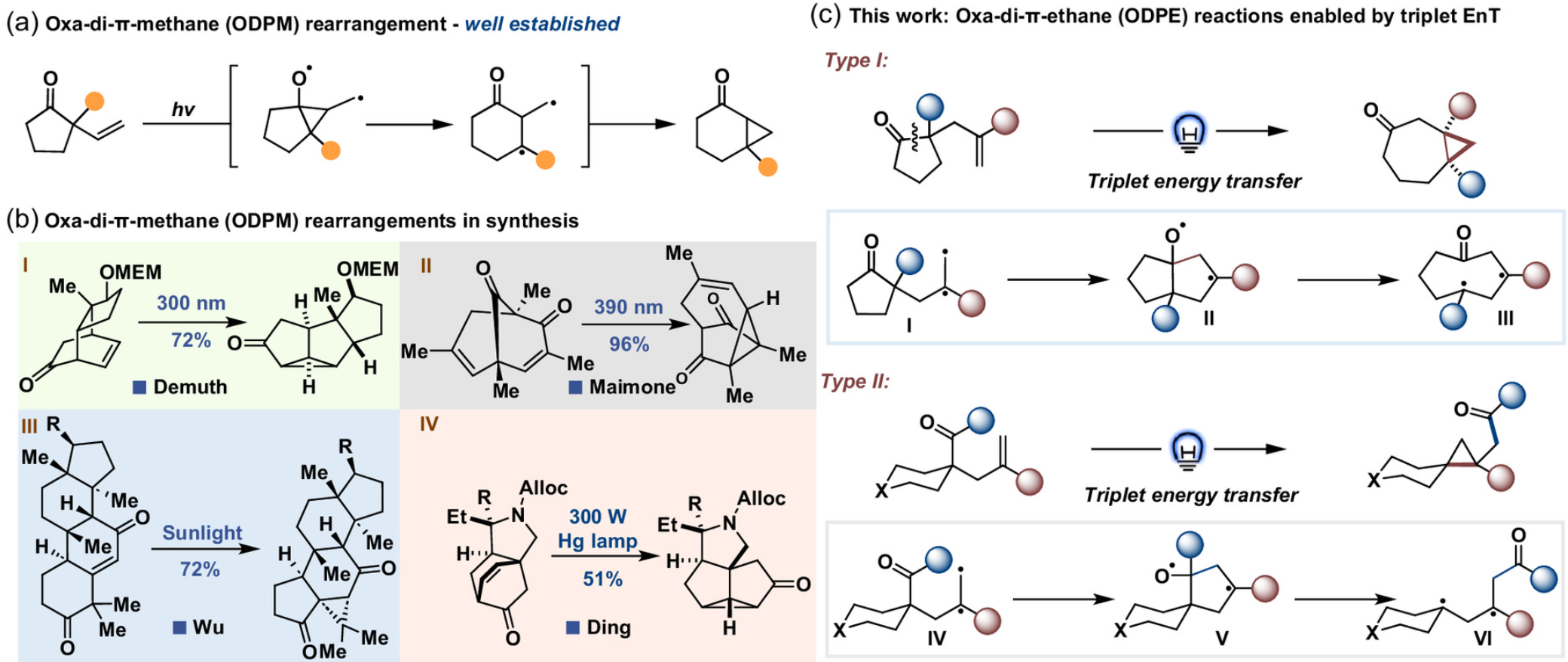 氧杂-双-π-甲烷(ODPM)重排是一种通过直接光照或三重态敏化光化学途径将β,γ-不饱和酮转化为环丙基酮的通用方法(图1A)。这一转化反应于20世纪60-70年代被发现并深入研究,至今仍在天然产物合成与修饰中具有广泛应用(图1B)。如何拓展反应类型以及利用可见光来实现相应的化学转化是目前自由基化学的前沿研究方向。