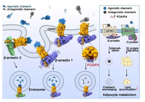 此外,脂质组亲和质谱分析发现,两种内源性脂肪酸(棕榈油酸和棕榈酸)可能通过介导非激活态GPR1与β-arrestin 1的结合,促进GPR1的自发性内吞,提示该类脂分子对于GPR1清除非激活型趋化素发挥调控作用。研究人员进一步检测脂肪细胞中的脂质含量,发现在高脂环境下CMKLR1促进脂肪代谢,降低了脂质积累,而GPR1通过清除非激活型趋化素促进CMKLR1激活,从而辅助脂质代谢。基于上述发现,研究团队提出了GPR1功能调控的“磷酸化编码-脂质辅助”模型:预先存在的磷酸化条形码负责启动识别,而内源性脂质则作为变构稳定剂巩固结合,二者协同确保了GPR1“清道夫”功能的高效执行。