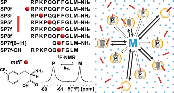 NK1R是介导P物质生理功能的关键受体,与疼痛、炎症及抑郁症密切相关,其拮抗剂能高选择性结合大脑中的NK1R,用于预防化疗药物引发的急性及迟发性恶心呕吐。目前国内已上市的NK1R拮抗剂包括阿瑞匹坦、福沙匹坦以及奈妥匹坦帕洛诺司琼。尽管冷冻电镜技术已获得NK1R的主体构象,但P物质高度柔性的N端在已有结构中一直缺失。为解决这一难题,研究团队在SP序列特定位点引入高灵敏的19F标记核磁共振(19F-NMR)探针,在水溶液环境中成功捕捉了配体的动态行为。