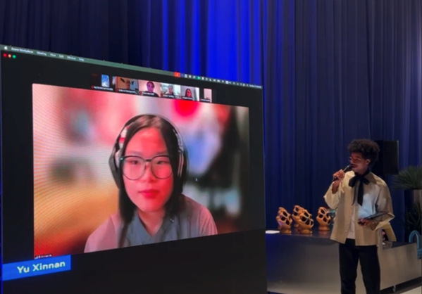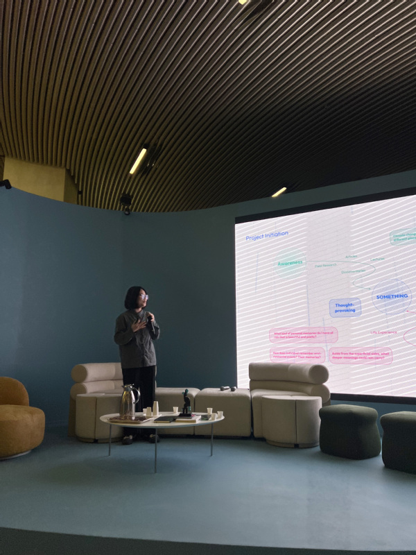 创作团队成员、2022级本科生俞欣楠在Tanween国际设计论坛上发表主题演讲,阐述项目如何通过探索雨与织物的互动研究,使自然力量成为设计叙事的参与者,并探讨设计师如何借助细腻观察、触觉体验与材料探索,构建人与自然、人与他者之间的新型共感路径。演讲在现场引起了来自全球观众的广泛共鸣与积极反响。
