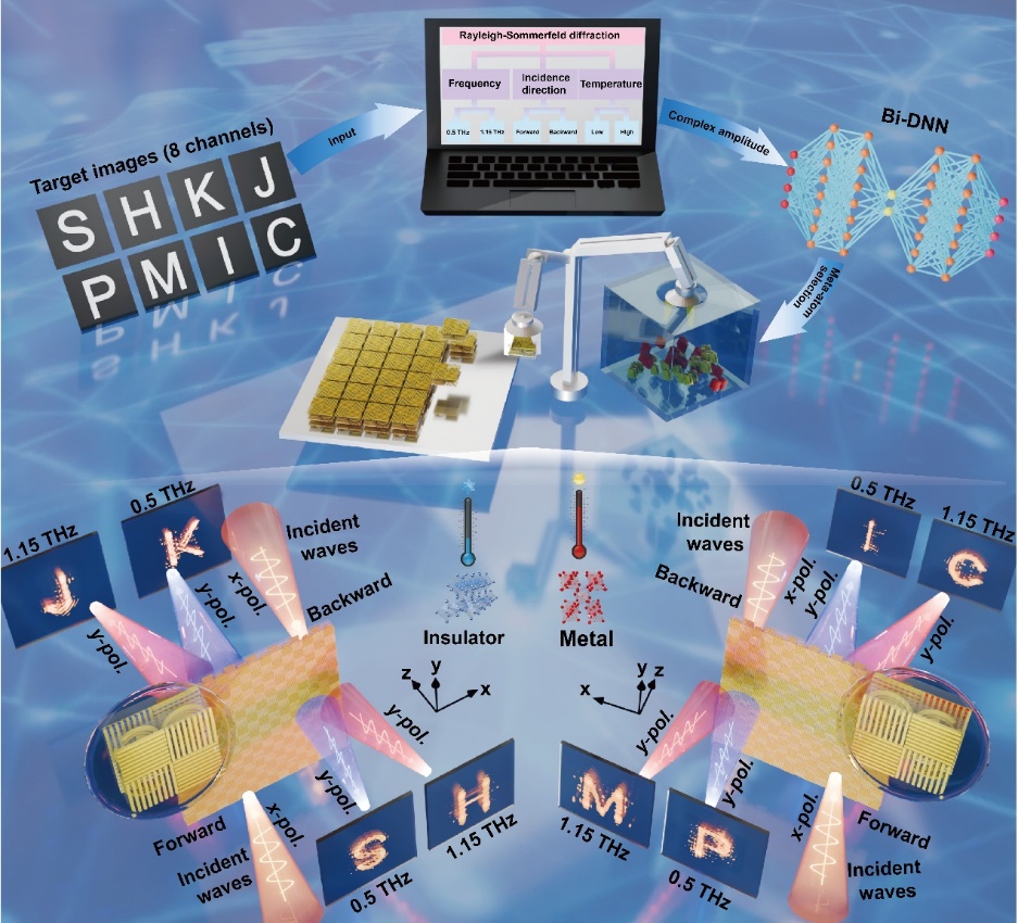 近日,上海科技大学信息科学与技术学院曹文翰课题组提出了一种基于热致相变材料二氧化钒(VO₂)的热可调谐定向Janus超表面:采用双向深度神经网络(Bi-DNN)辅助完成超表面的逆向设计,最终实现了多通道、低串扰、高效率的太赫兹全息成像与信息加密。该成果以“Terahertz holographic image encryption via thermally tunable directional Janus metasurface”为题,发表于材料与智能交叉领域国际期刊《智能材料》(SmartMat)。