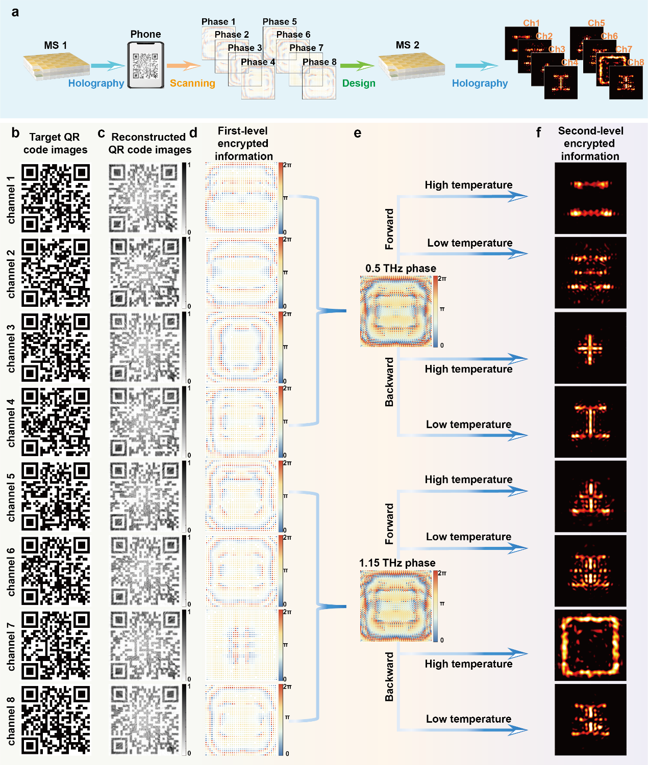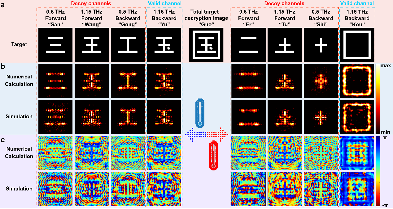 Janus超表面的设计(图1)先通过联合调控入射方向、频率与温度三个自由度,将不同目标图像分别存储至多个独立通道。随后,使用Bi-DNN对目标电磁响应与超原子结构参数之间进行双向映射,完成多参数超表面的快速、精准逆向设计。该超表面在0.5 THz与1.15 THz双工作频点下实现了八通道全息成像。数值模拟结果表明,超表面的全息成像效率最高可达78%,单元交叉极化透射率超过90%,且通道间串扰极低。研究团队创新性地将太赫兹全息技术与汉字的“可重组”特性相结合,构建了高安全性信息加密系统(图2)。以汉字“国”为例,将其拆解为“三、王、工、玉、二、土、十、口”八个汉字,并分别存储于八个独立通道中。其中,仅有两个通道为有效通道,其余六个均为欺骗通道。攻击者必须准确破译出全部有效通道并完整提取其信息,才能成功获取目标汉字。这种真伪混杂的通道设计提升了加密系统的安全性。