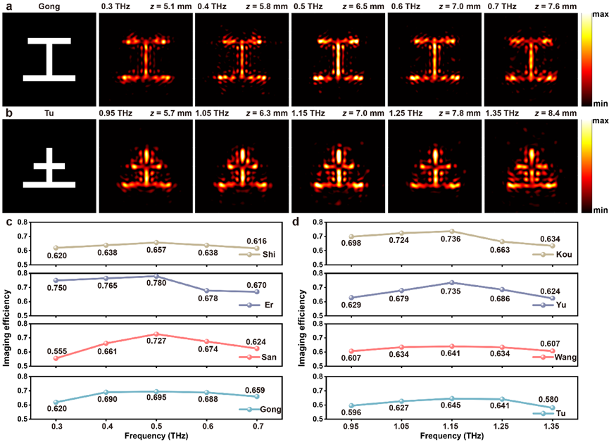 为进一步提升系统安全性,研究团队提出了基于双Janus超表面与QR码的二次加密方案(图3)。该方案将初级超表面(MS1)所重建的QR码图案作为第一层加密信息,并将其隐藏的相位信息用于设计次级超表面(MS2)。攻击者必须先后破解两个超表面的加密信息,并正确组合所有通道的内容,才能还原出解密汉字“国”。这种双重加密机制显著增强了系统的整体安全性。此外,该加密系统还具备宽带响应特性,在0.3-1.35 THz范围内均能保持稳定性能(图4)。本工作提出的热调控超表面动态加密策略,为解决传统加密技术中的密钥固定、易破解等问题提供了新思路。作为动态可重构太赫兹加密技术的创新探索,该设计在未来高安全性通信、加密及信息存储等领域展现出良好的应用潜力。