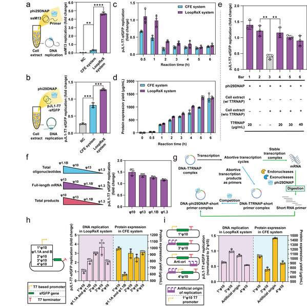 研究首先设计构建了包括DNA复制、基因表达和人工拟核在内的三个关键模块,通过整合实现基因复制-转录-翻译过程的偶联,完成了体外中心法则系统的构筑(图1)。随后利用机器学习、模型构建预测等技术对反应体系中所涉及的诸多关键成份及变量因素进行全面优化,综合考虑DNA复制和基因表达的协同效应,获得了高性能的体外中心法则系统。最后利用人工拟核实现了对基因模板的保护和循环利用,证明了该体外中心法则系统的可迭代性及其在人工代谢通路重构等方面的应用潜力。