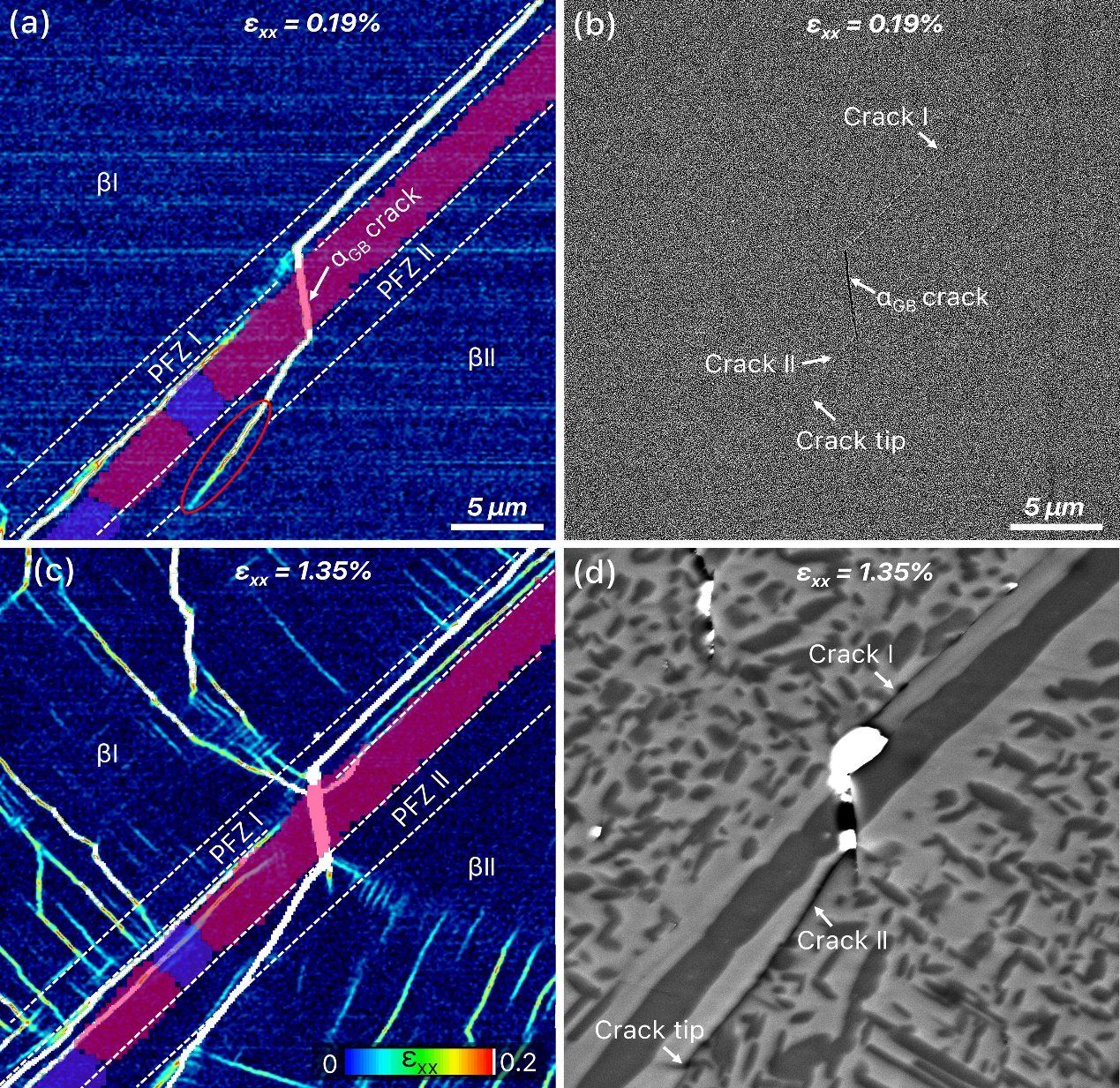 本研究针对增材制造新型高强钛合金(Ti-3Al-6Fe-6V-2Zr),利用原位高分辨数字图像相关(HR-DIC)技术结合跨尺度组织表征,定量表征了合金在外加载荷条件下的微观应变演化过程,获得了含氢环境下与晶界α相关联的微观应变局域化和裂纹萌生与扩展行为。结果表明,在塑性变形早期,与晶界α相近邻的析出相贫化区(PFZ)产生了高达晶内应变两个数量级的微观局域化应变(图1);在含氢环境下,晶界α相在氢和β相晶格膨胀导致的高应力共同作用下发生氢致裂纹萌生,该裂纹与析出相贫化区内的高度局域化位错滑移交互作用,导致裂纹快速扩展,使合金塑性和韧性显著降低(图2)。