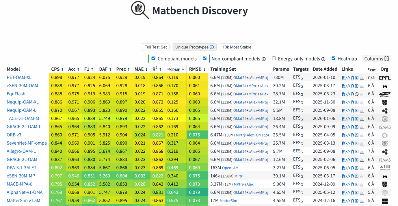 Matbench Discovery 榜单截图(2026.1.14)