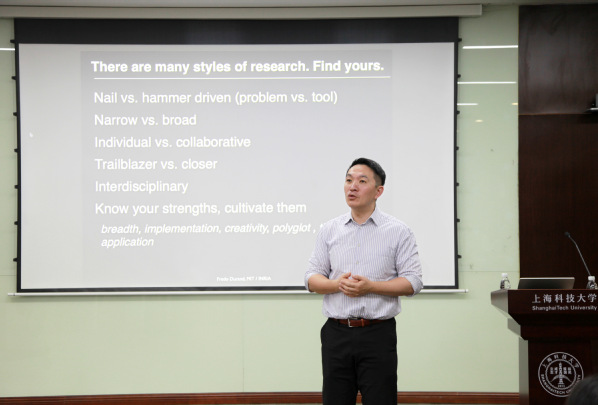 在“新教师如何有效启动教学与科研”主旨报告中,虞晶怡结合自身丰富的教学科研经历,分享了一系列实用建议。在本科生培养方面,他建议设计具有一定挑战度的学习任务,加强过程跟踪与指导,重点培养学生解决问题和批判性思维的能力。在研究生培养方面,他建议应根据其学术背景与发展阶段,合理设定培养期望,通过安排难度适中的课题任务,逐步建立学生的科研自信。关于研究方向的确立,他主张课题应具备开放性、成长性和创新性,教师可结合自身优势开展跨学科合作,并保持对科研工作的热忱与投入。报告结束后,虞晶怡还就如何平衡教学与科研、加强团队建设等话题,与在场教师进行了深入交流。