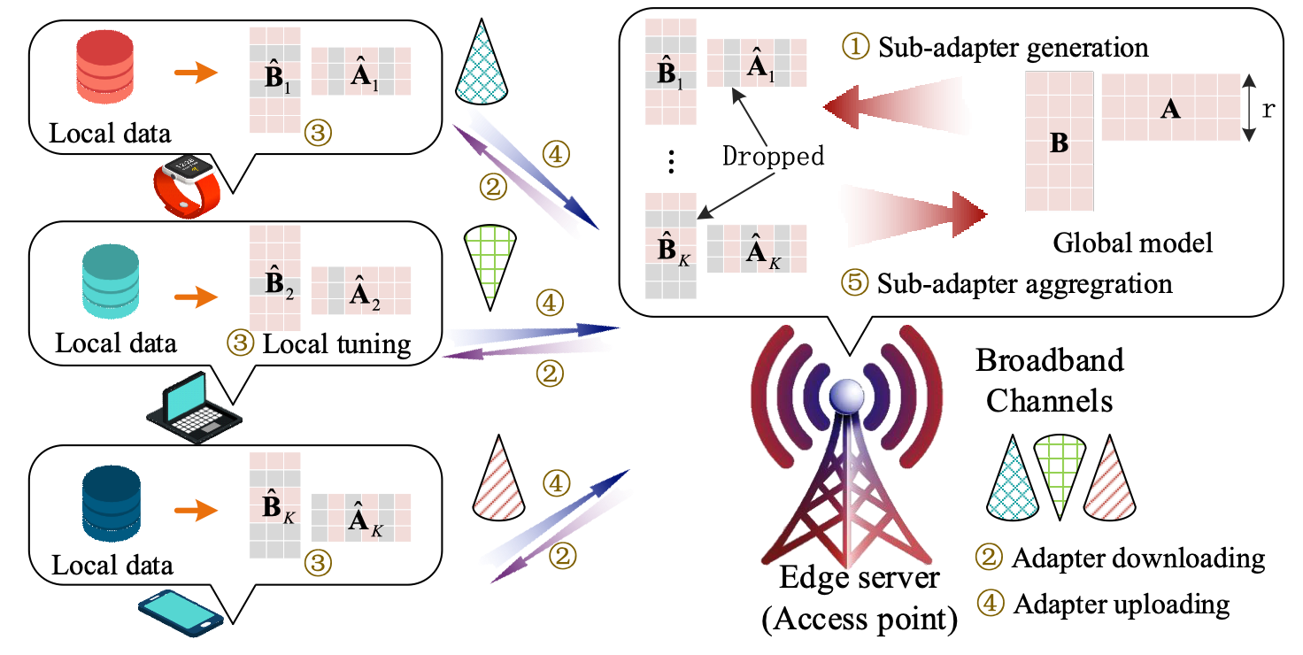 随着ChatGPT、LLaMA 等大语言模型的广泛应用,业界越来越关注如何针对特定下游任务进行微调。然而,在实际应用场景中,数据往往分布在千家万户的手机、平板或智能设备中,传统的集中式微调面临着严峻的隐私安全挑战。联邦学习(Federated Learning)作为一种分布式训练模式,成为了大模型微调的选择。但在边缘网络环境下,现有的联邦微调技术面临着两大瓶颈。一方面是性能瓶颈,由于终端数据量有限且多样,模型在微调过程中极易陷入“过拟合”,即虽然在本地数据上表现优异,但面对新任务时泛化能力不足。另一方面是资源瓶颈,边缘设备在计算功耗和通信带宽上极为受限,频繁的参数同步会造成巨大的网络延迟和电量消耗。