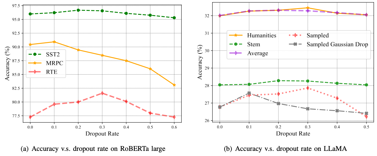 图2:丢弃率在不同模型不同数据集上的性能表现