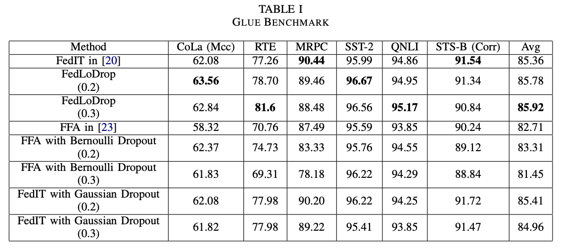 实验验证在RoBERTa、LLaMA-7B 以及拥有 340 亿参数的大模型 Yi-34B 上进行了广泛测试。基于GLUE 和 MMLU 等全球公认的权威测评基准上,FedLoDrop 展现出了卓越的泛化性能。