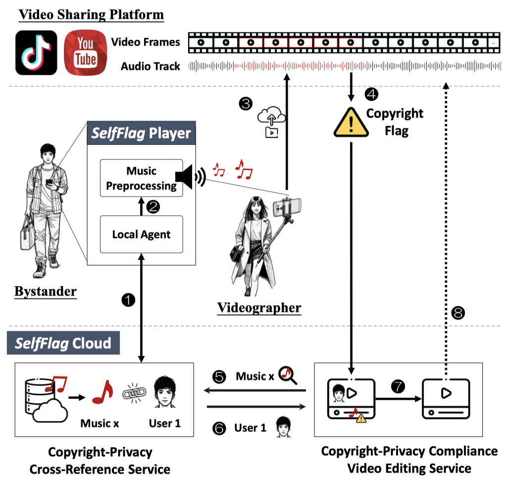 杨智策教授课题组题为“Bystander Privacy in Video Sharing Era: Automated Consent Compliance through Platform Censorship”的论文发表在人机交互领域会议 CHI 2025(Conference on Human Factors in Computing Systems)。研究聚焦于视频分享场景下日益突出的“旁观者隐私”问题,提出了一种名为 SelfFlag 的新思路(图4)。系统测量了主流视频平台的内容审查行为,论证了基于版权音乐的触发方式在现实环境中的可行性,并进一步设计了配套工具,帮助视频创作者在满足旁观者隐私要求的同时,尽量保留原视频的内容质量与观感。该工作为旁观者隐私保护提供了一种以旁观者为主导、依托现有平台机制的全新路径。CHI是中国计算机学会推荐的A类会议,人机交互领域的旗舰会议。信息学院2023级博士研究生廖思是该论文的第一作者,上科大为第一完成单位,合作者有来自香港科技大学(广州)的学者,杨智策教授为通讯作者。