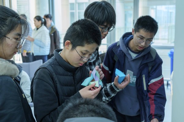 活动现场一侧的展示区,陈列着来自各专业学生的学术海报与创意作品。内容涵盖数学理论的延伸、跨学科研究的数学视角,将抽象工具与自然科学、前沿问题紧密结合,体现了数学作为基础学科的强大渗透力。GeekPie社团的互动投针和魔改音乐,五彩缤纷又形状各异的几何折纸,以及同学们自发开发的数织小游戏吸引众多师生驻足体验,在互动中感受数学的创意表达。