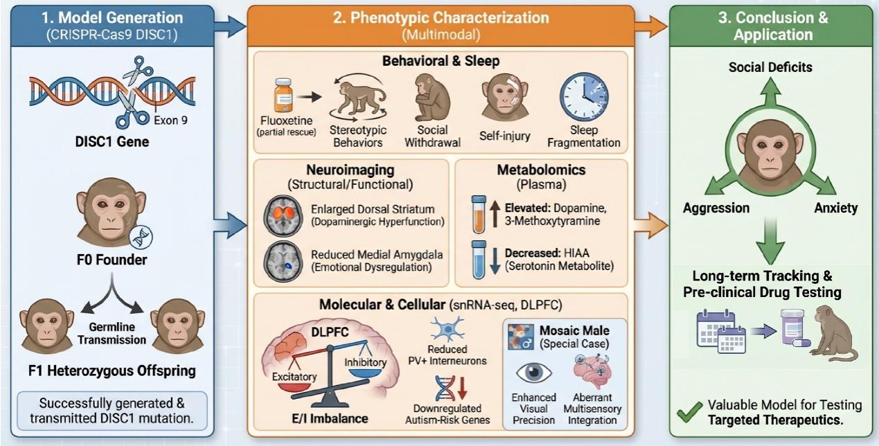 精神疾病是具有高度遗传异质性和复杂病因的神经系统疾病,其发病机制尚未完全阐明。当前的啮齿类动物模型在模拟人类精神病理表型方面存在很大的局限,难以有效重现社交认知障碍、情绪调节异常等核心症状。非人灵长类动物已成为研究人类神经系统疾病和复杂遗传疾病不可替代的动物模型。本研究利用CRISPR-Cas9技术编辑食蟹猴DISC1基因,构建非人灵长类精神疾病模型,并对其症状进行多维度表征。进一步繁殖了第一代(F1代)DISC1突变的食蟹猴,并进行了系统分析。