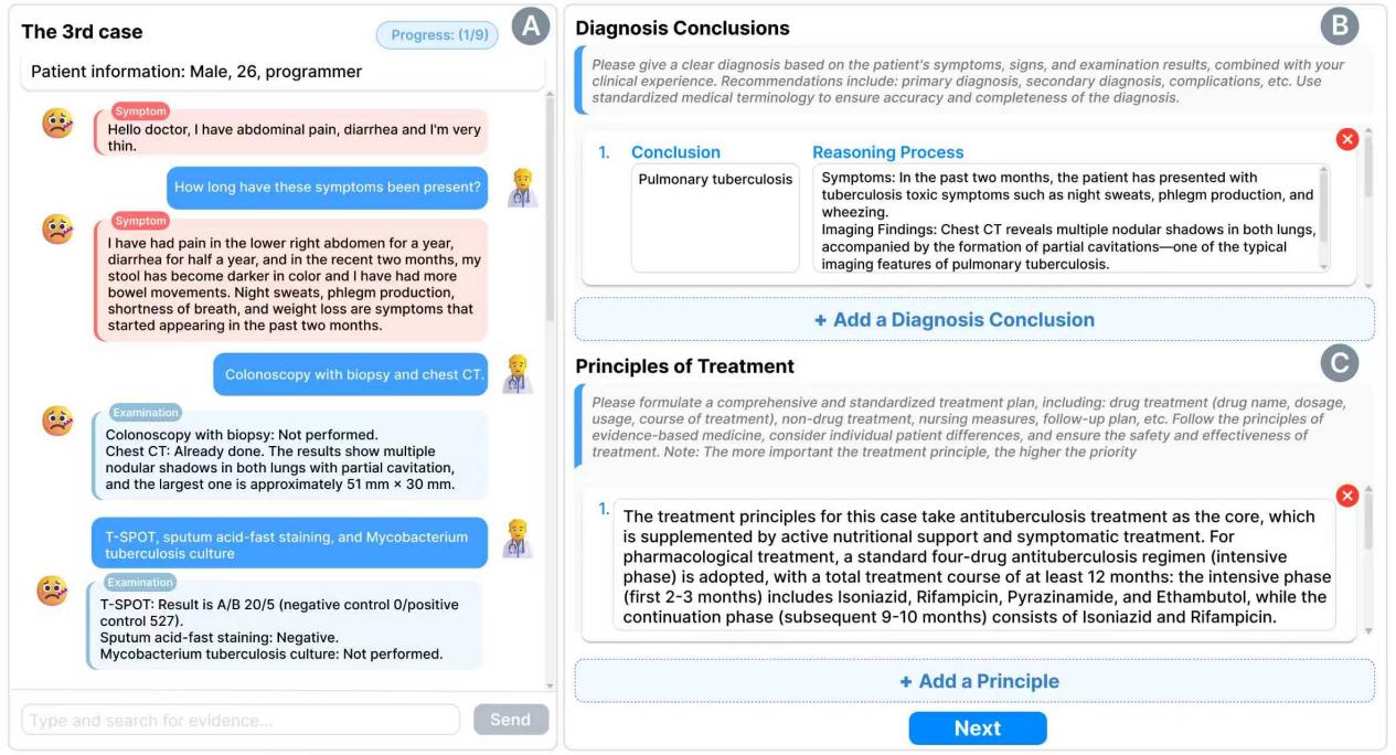 图1. 使用系统与大模型模拟的病人问诊,收集案例分析的诊断数据。