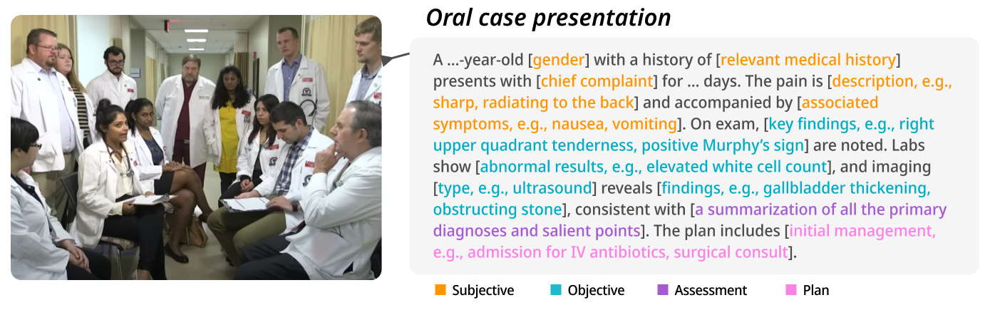 图5. 口头病例汇报示例。 左侧为临床环境中的病例汇报场景,医疗专业人员围绕病例展开讨论;右侧为口头病例汇报的结构化框架,包括四个核心部分:主观信息、客观信息、评估和计划,分别对应病史与症状、检查结果、诊断分析及治疗方案。