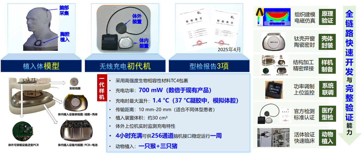 基于该方法,团队开发了针对256通道的脑机接口充电系统,在700 mW接收功率下将钛壳温升控制在2°C以内,满足ISO14708-1医疗安全标准,在同等温升约束下较行业竞品功率提升4倍,并于2025年通过动物植入实验,验证了工程可行性(图2)。通过本次合作,上科大与临港实验室建立完整的脑机接口充电系统开发链条,在法规解读、原理验证、壳体封装、电路实现、样机制备、系统联调、外部送检、植入实验等环节积累了丰富经验,确保技术成果能够快速转化。