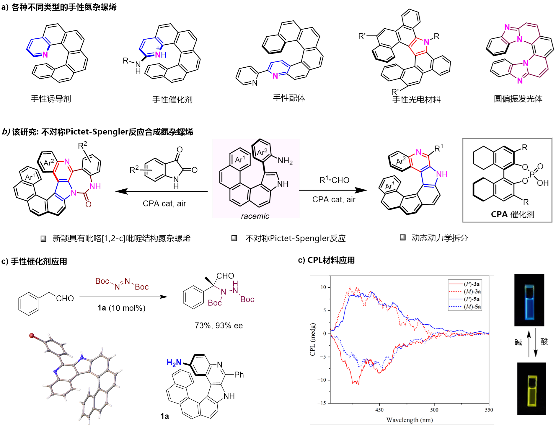 螺烯是由邻位稠合芳香环构成的螺旋形手性分子,凭借独特手性骨架在多领域备受关注。与纯苯环构成的碳螺烯不同,氮杂螺烯因骨架中引入含氮芳香环,分子电子性质、氧化还原特性与配位能力得到显著优化,在手性诱导、不对称催化、手性发光材料等方向展现重要应用潜能。长期以来,单一对映体氮杂螺烯主要依赖色谱拆分或化学计量试剂拆分获取,迫切需要发展高效直接的催化不对称合成方法。