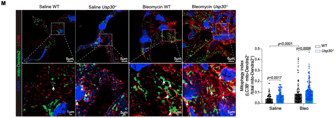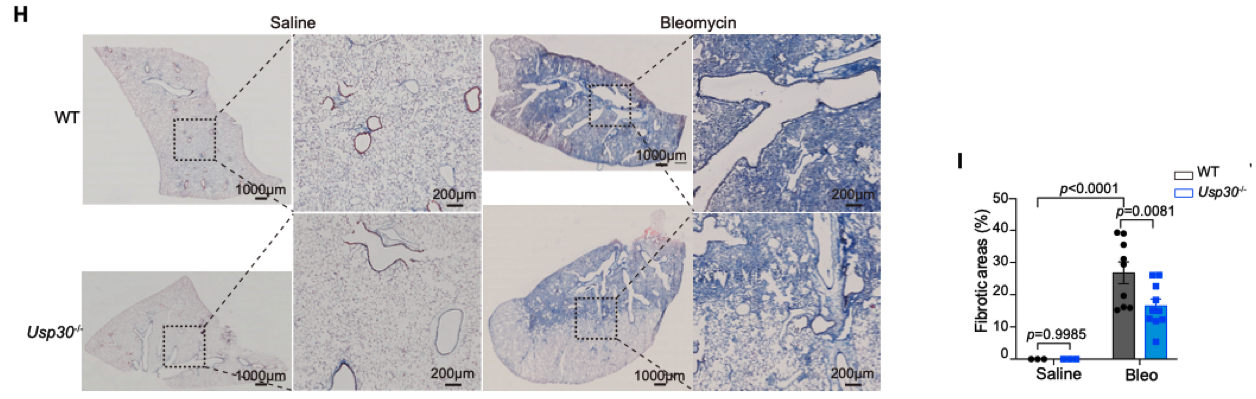 团队首先分析了公开的人类肺纤维化组织的转录组数据,发现纤维化肺组织中氧化磷酸化、线粒体呼吸及线粒体自噬相关的通路显著下调,其中以上皮细胞中的变化最为明显。进一步研究发现,在博来霉素诱导的肺纤维化模型中,线粒体自噬负调控因子Usp30缺失,可以提高肺组织中的线粒体自噬水平,并显著减轻肺组织纤维化程度,降低胶原沉积和成肌成纤维细胞积累。