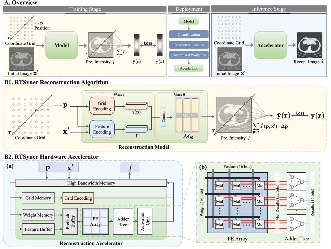 图:RTSyner软硬件协同实时重建框架。该框架针对稀疏视角CT重建的实时性瓶颈,联合优化隐式神经表示模型与专用硬件加速器,实现了高质量、高速度、低功耗的实时重建。