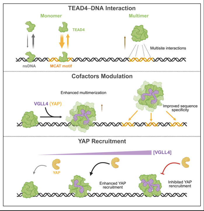 This study combined fluorescence confocal microscopy with optical tweezers to achieve real-time, dynamic observation of TEAD4-DNA interactions. The results showed that monomeric TEAD4 can bind MCAT sequences with a relatively fast association rate, but it also dissociates rapidly, resulting in a short residence time on DNA (Figure 1, top). However, TEAD4 can form multimers, and significantly prolong its residence time on DNA. Both cofactors YAP and VGLL4 can promote TEAD4 multimerization and enhance its sequence specificity (Figure 1, middle). Further research revealed that VGLL4 uniquely exhibits a biphasic, stoichiometry-dependent regulation on TEAD4’s recruitment of YAP. Specifically, VGLL4 promotes TEAD4 multimerization at low VGLL4:TEAD4 molar ratios to enhance YAP recruitment, whereas at high ratios, VGLL4 inhibits YAP recruitment by saturating the TEAD4 YBD domain. This discovery uncovers a precise regulatory switch within the Hippo pathway based on the relative abundance of cofactors.